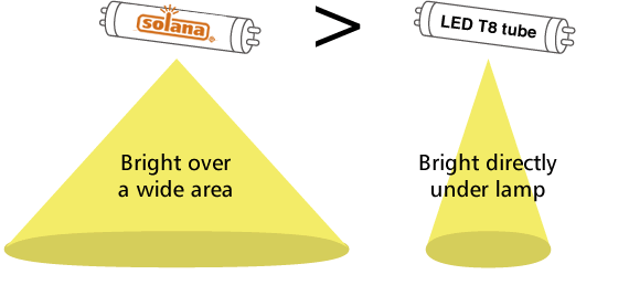 LED tubes emit light in mostly one direction. Because of this, the illuminance (Lx) is strong directly under the lamp, but the light does not illuminate a wide area.